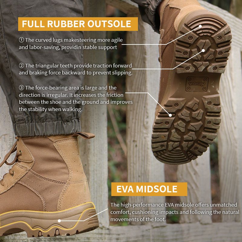 Designed for the toughest terrain, the Cordura Fabric Rubber Desert Tactical Boots deliver lightweight comfort and serious stability—so you can move with confidence over rock, sand, and everything in between.The Cordura upper stands up to abrasion and keeps debris out, mile after mile. Underfoot, a high-performance EVA midsole cushions every strike and moves naturally with your stride. And the rubber outsole? It grips loose ground and rough trails alike—built to adapt, built to last.