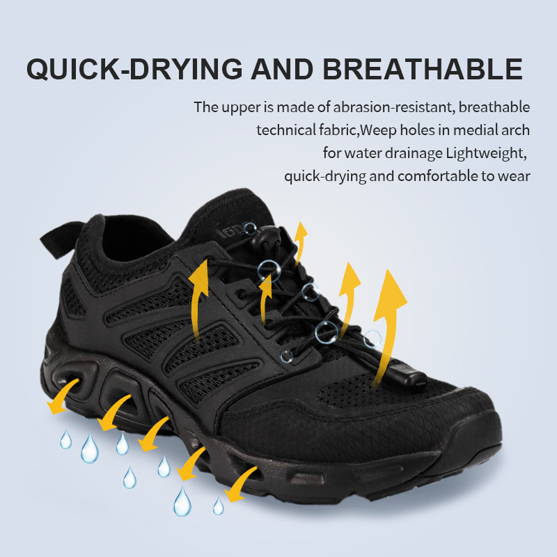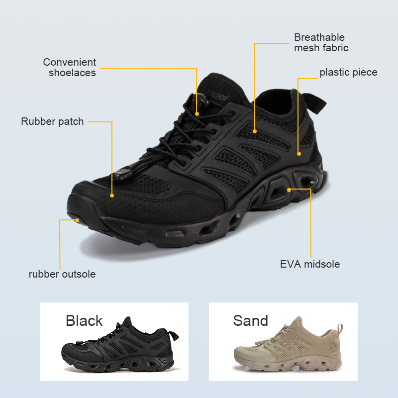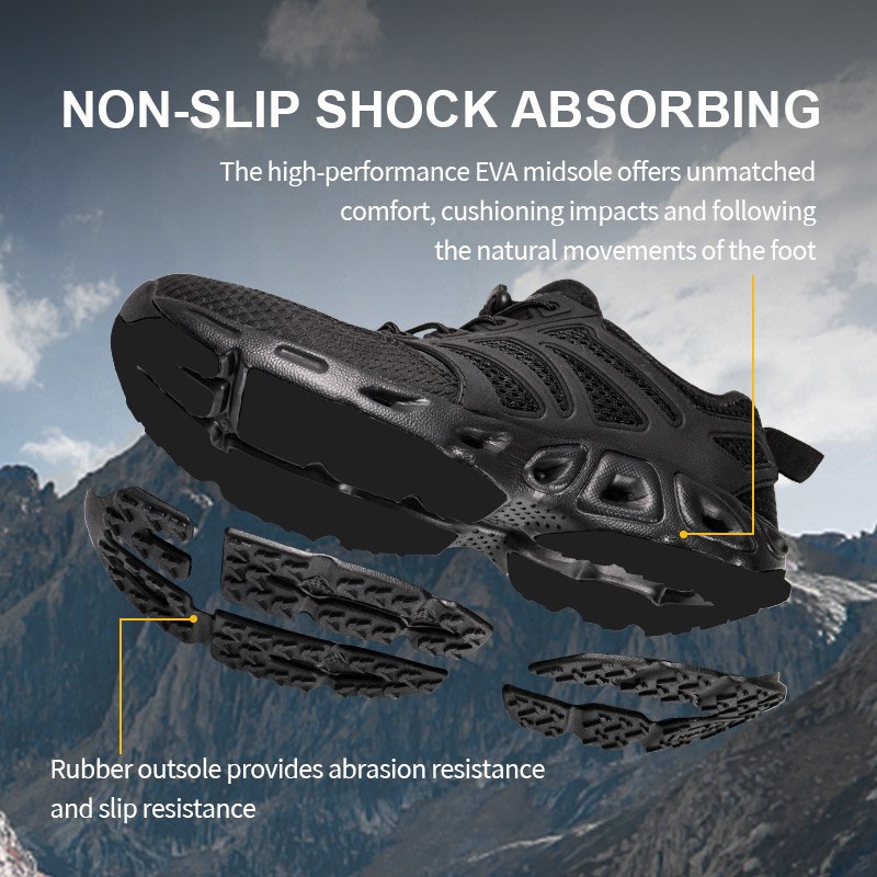 EVA Shock Absorbing Trekking Shoes is built for the trail—wet or dry. With quick-drying materials and drainage ports in the arch, it sheds water fast when you go from stream to summit. A rubber heel patch locks in stability, while the EVA midsole delivers soft, shock-absorbing comfort underfoot. And the rugged rubber outsole? Built to grip just about anything—rock, mud, loose gravel. It’s amphibious, agile, and built to move with you.