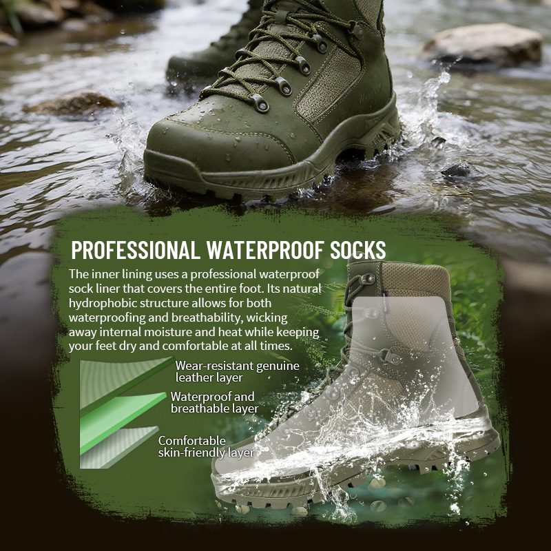 The inner lining uses a professional waterproof sock that covers the whole foot. Its natural hydrophobic structure keeps water out while letting heat and sweat escape—so your feet stay dry and comfortable.