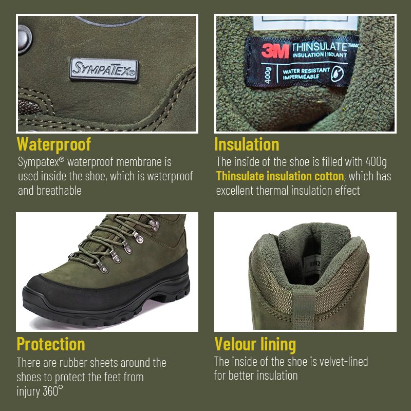 These Sympatex Waterproof Insulation Thinsulate Hunting Boots are available for customization in colors, materials, and details, with MOQ of 800 pairs, ideal for brand collaborations and group procurement. And these hunting boots have following advantages: